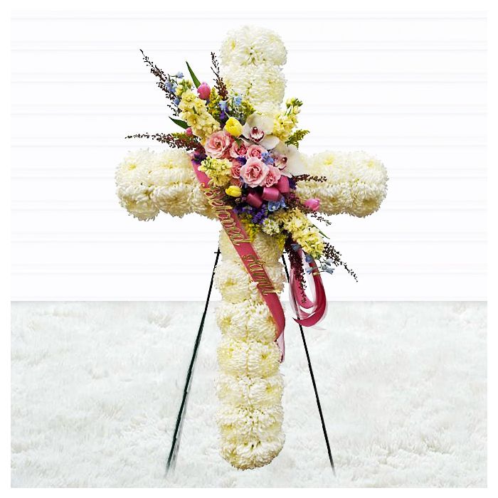 This beautiful cross of white crysanthemums and mixed flowers is the perfect way to honor a loved one. The 1.5 feet height makes it a stunning addition to any funeral or memorial service. The mix of flowers in the center is both beautiful and unique, adding a special touch to this already extraordinary arrangement.