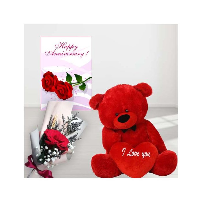 1.5 feet height teddybear with single red rose and anniversary greeting card