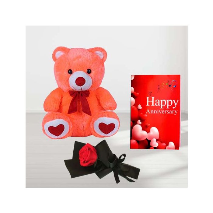 This anniversary, make it extra special with our 1 foot tall teddybear accompanied by a single red rose and anniversary greeting card. Your significant other will be absolutely amazed at this thoughtful gift that shows just how much you care. The teddybear is extremely soft and huggable, making it the perfect cuddle buddy, while the rose adds a touch of romance. The greeting card lets you express your love in your own words, making this an incredibly personal and unique gift. Order now and make this anniversary one to remember!