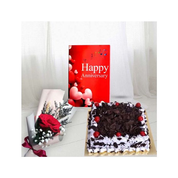 Happy anniversary! Celebrate your special day with a delicious 1 kg black forest cake and a beautiful single red rose. This anniversary card is the perfect way to say "I love you" to your special someone.