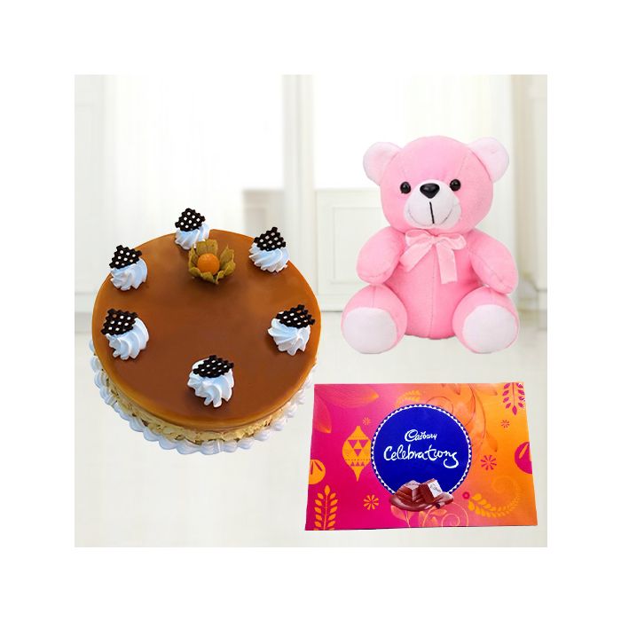 Butterscotch cake with 6 inch height pink colour teddy bear with box of celebration chocolates