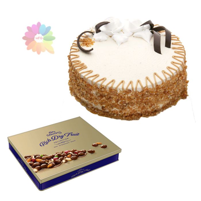 Introducing the butterscotch cake with box of Cadbury premium chocolates. This delicious cake is made with real butterscotch flavor, and is covered in a rich, creamy frosting. It's perfect for any occasion, and is sure to please everyone.The box of chocolates is a special touch that makes this cake even more special. The chocolates are made with the finest ingredients, and are absolutely delicious. They're the perfect finishing touch to this already amazing cake.So if you're looking for a cake that's sure to impress, order the butterscotch cake with box of Cadbury premium chocolates today. You won't be disappointed.