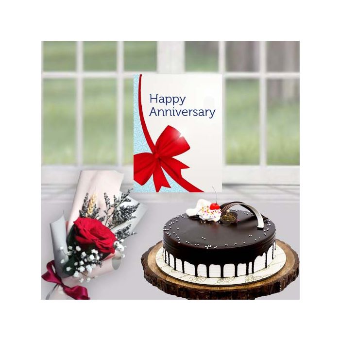 1 kg choco vanilla cool cake, single red rose, anniversary card
