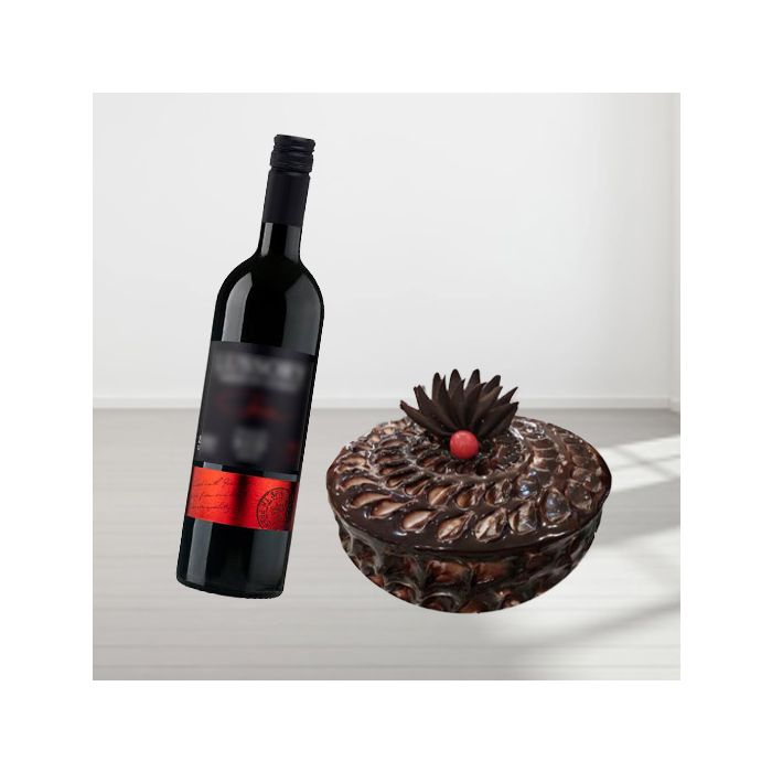 Product Description 5 | chocolate fantasy cake with bottle of red wine |