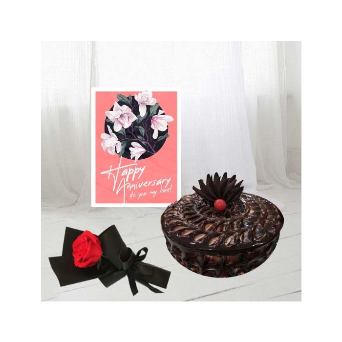 1 kg chocolate fudge cake, single red rose, anniversary card