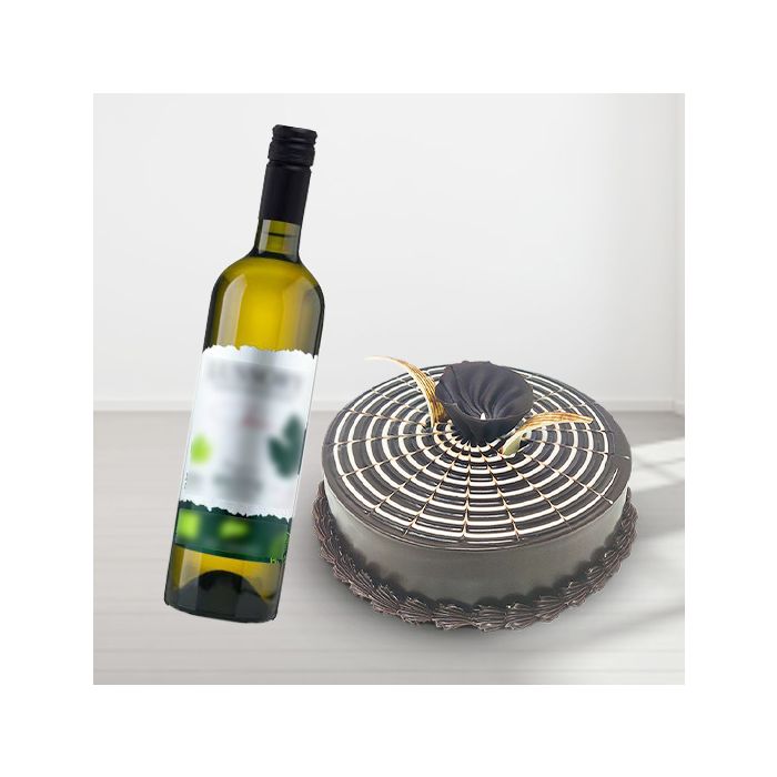 Product Description 5 | chocolate zebra cake with bottle of white wine |