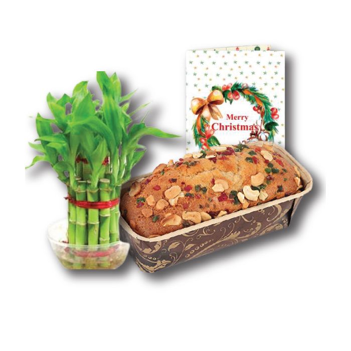 Product Description 1 | 1 Kg Dry Fruit Plum Cake With Single Layer Lucky Bamboo Tree And Christmas Greeting Card |