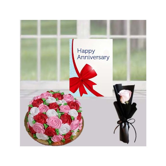 1 kg floral theme cake in vanilla flavour , single white rose, with anniversary greeting card
