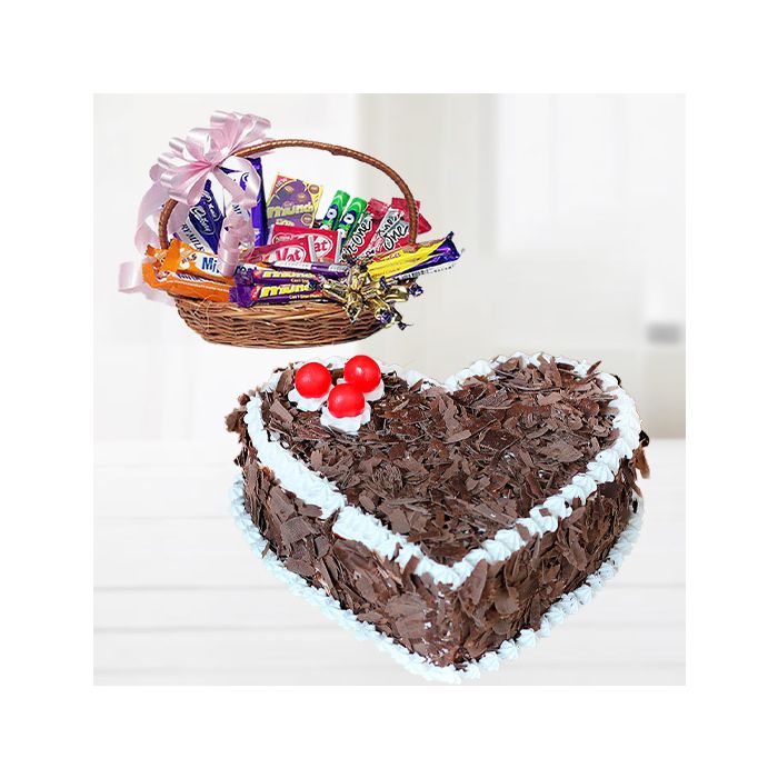 Product Description 5 | heart shape black forest cake with Basket of assorted chocolates |