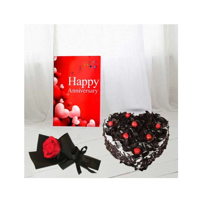 1 kg heart shape black forest premium quality cake, single red rose, anniversary card