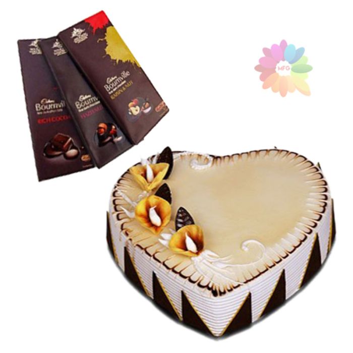 Product Description 5 | heart shape butterscotch premium quality heart shape cake with set of 3 bournville dark chocolates |