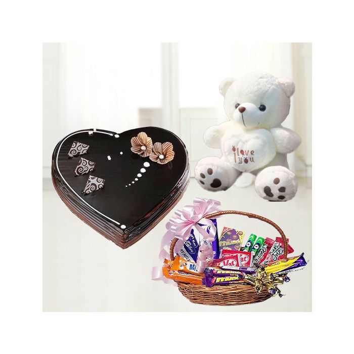 heart shape chocolate truffle cake premium quality cake with basket of assorted chocolates with 2 feet height white teddy bear
