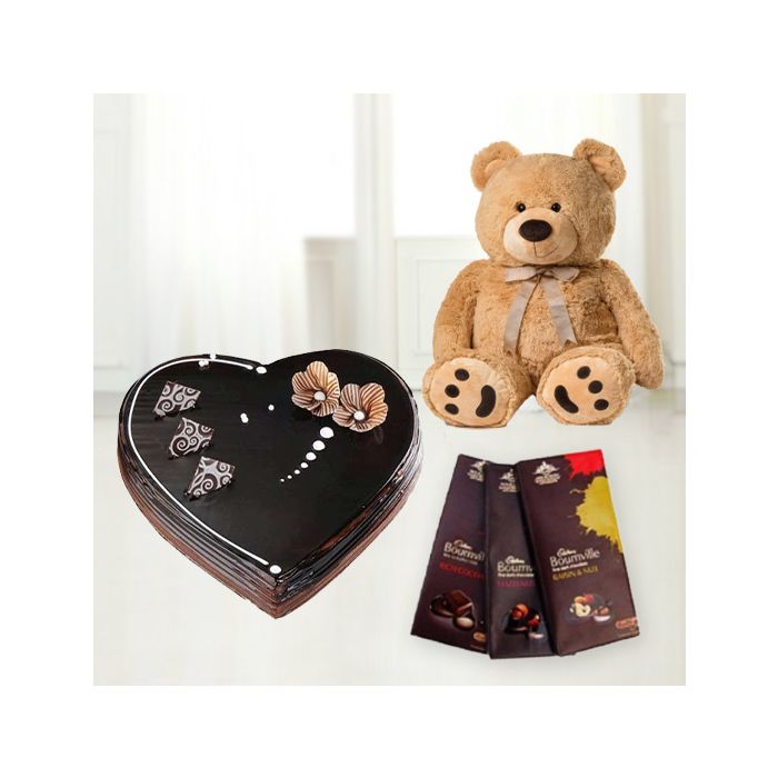 Heart shape chocolate truffle cake with 6 inch height teddybear with set of 3 bournville chocolates