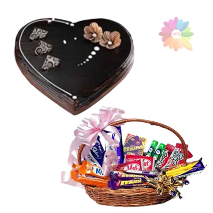 Product Description 5 | heart shape chocolate truffle cake with basket of assorted chocolates |