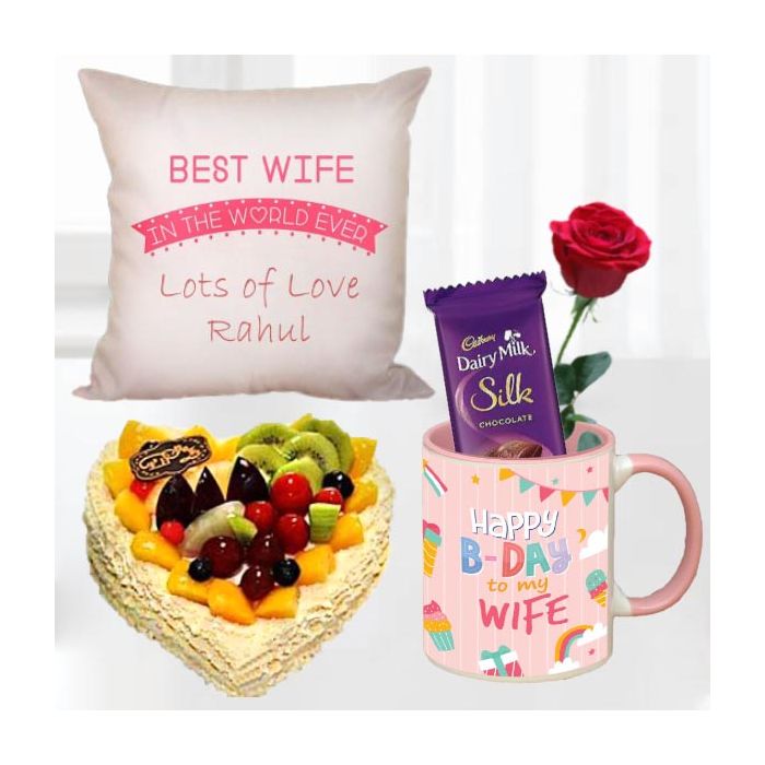 1 kg heart shape mix fruit cake, photo mug with a red rose and dairy milk silk chocolate, with photo cushion