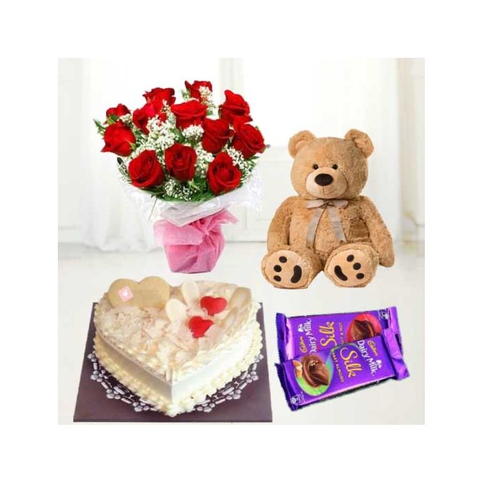 heart shape white forest cake with 1 feet height brown teddybear with 10 red roses bouquet with 2 dairy milk silk chocolates