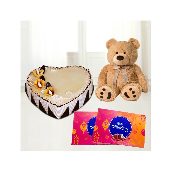 heartshape butterscotch cake with 2 box of celebration chocolates with 1 feet height teddybear
