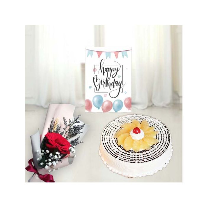 1 kg pineapple fresh cream cool cake,single red rose, birthday card