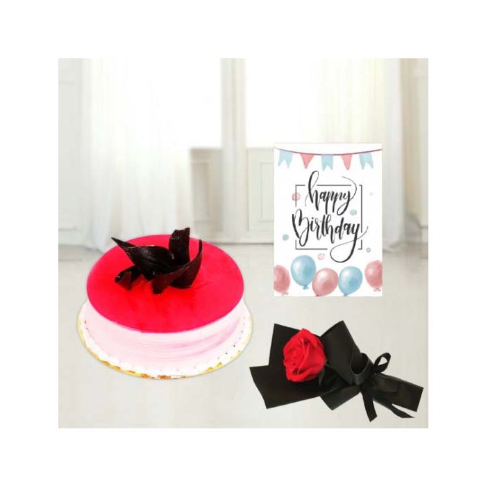 1 kg strawberry cool cake: A deliciously moist and fluffy cake made with real strawberries, milk, and cream. The perfect treat for any birthday or special occasion.Single red rose: A beautiful red rose, the symbol of love and appreciation. The perfect way to show your loved one how much you care.Birthday card: A birthday card with a special message just for them. Whether itโs funny, heartwarming, or romantic, this card is sure to make them smile on their big day.