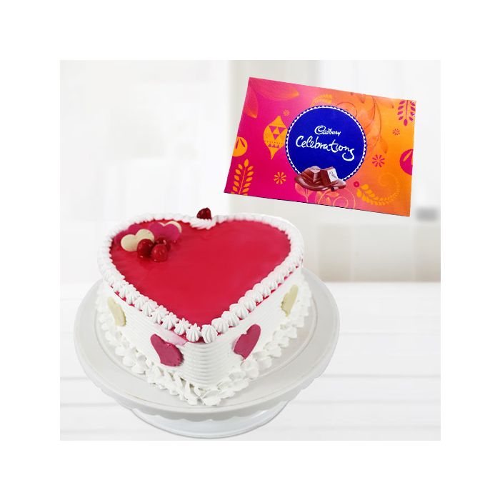 Product Description 5 | strawberry vanilla heart shape cocktail cake with box of cadbury celebrations |