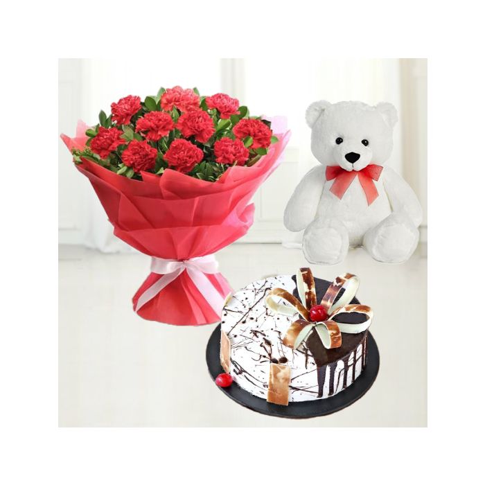 vanilla fresh cream cake with 15 red carnations with 1 feet height white teddybear