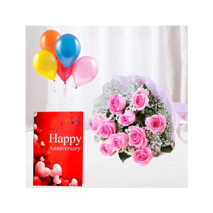 What could be more romantic than receiving a bouquet of 10 pink roses on your anniversary? Add in 5 balloons and an anniversary card, and you have the perfect way to show your loved one how much you care.These beautiful flowers will fill any room with their lovely fragrance, and the balloons are sure to bring a smile to your face. The card is the perfect way to express your love and gratitude for another year together. All of this comes packaged in a beautiful gift box, making it the perfect present for that special someone in your life.