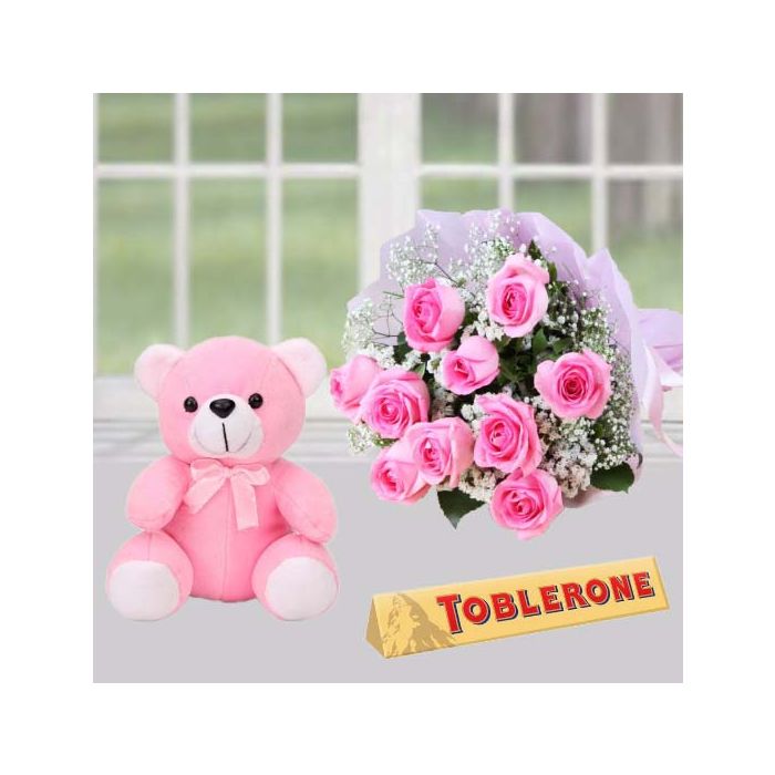 10 pink roses with 6 inch pink teddybear with toblerone chocolate