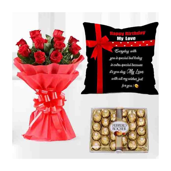 Looking for the perfect way to say 'I Love You'? Look no further than this exquisite bouquet of 10 red roses. Each rose is a symbol of love and together they Create a truly romantic gesture. Side by side with a box of 24 delicious Ferrero Rocher chocolates, this gift is sure to impress your loved one. To top it all off, we've added a photo cushion, so you can capture a special moment together and keep it close to your heart forever.