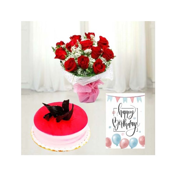 This special someone in your life deserves nothing but the best on their birthday. Send them our luxurious 10 red roses bunch, freshly-baked strawberry cream cake, and a beautiful birthday greeting card. They'll feel loved and appreciated with this gift from you! The 10 red roses bunch is a symbol of your love and devotion. The fresh strawberry cream cake is perfect for celebrating this special occasion. The top is adorned with hand-picked strawberries, making it a truly indulgent cake. The birthday greeting card expresses your warmest wishes for a happy birthday.Make this birthday extra special with our 10 red roses bunch, strawberry cream cake, and birthday greeting card set. Order now!