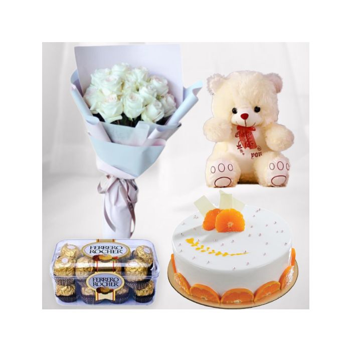 10 white roses bunch with 6 inch teddybear with orange cool cake with 16 pcs rocher ferrero chocolates