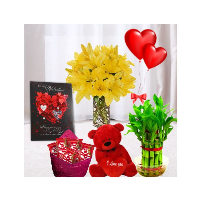 10 yellow lilies arranged in Glass Vase , pack of 5 fivestar , 6 inch height teddybear, 2 layer Lucky bamboo plant ,5 blown balloons with greeting card