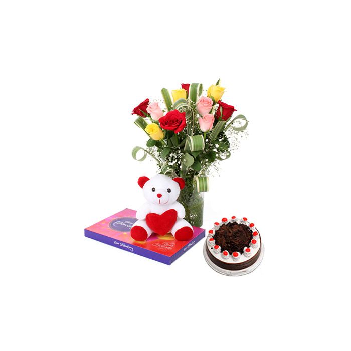 Product Description 1 | 12 mix roses in glass vase with 1 pound blackforest cake, celebration chocolate box along with 6 inch cute teddy |