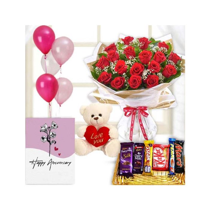 12 red roses bunch , 6 inch teddybear, Basket of assorted chocolates, anniversary Greeting card with 5 blown balloons