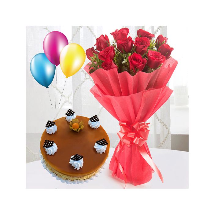 Looking for the perfect way to show your special someone how much you care? Look no further than this amazing 12 red roses with butterscotch cake with 3 blown balloons! This gorgeous arrangement is overflowing with romantic appeal, and is sure to take their breath away. The rich red roses are symbols of love and passion, while the delicious butterscotch cake is a sweet treat that will delight them. The 3 blown balloons add a festive touch and are sure to make this gift extra special. Whether you're celebrate a special occasion or simply want to show your affection, this gift is sure to impress.