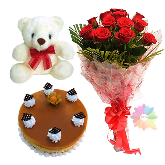 Looking for a romantic and luxurious gift for that special someone? Look no further than this gorgeous set of 12 red roses, accompanied by an adorable 6 inch teddy bear and rich, delicious black forest cake. This is the perfect way to show your love and affection, and is sure to make a lasting impression. Treat your loved one to something truly special today with this stunning gift set.