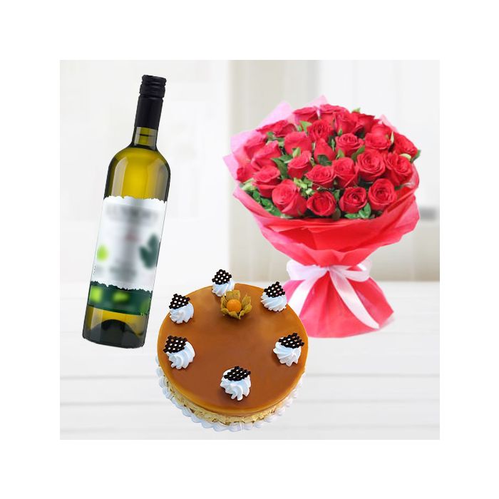 Product Description 5 | 12 red roses with butterscotch cake with bottle of white wine |