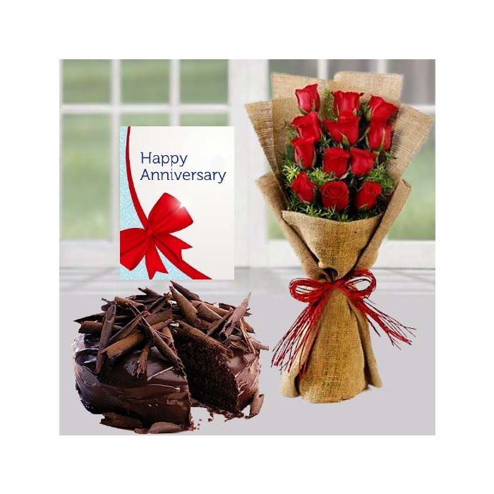 12 Red roses with jute packing, chocolate truffle cake, anniversary greeting card