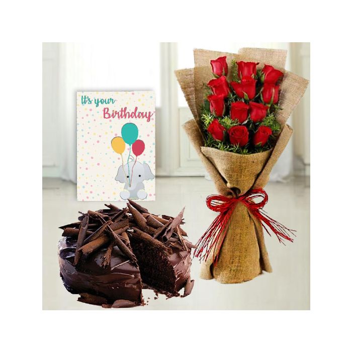 12 Red roses with jute packing, chocolate truffle cake, birthday greeting card
