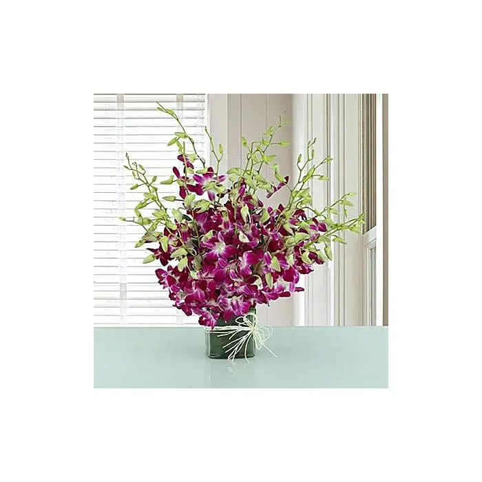 These beautiful orchids are arranged in a glass vase and make for a stunning display in any home or office. The 15 different flowers provide a splash of color and the long-lasting blooms are sure to please.