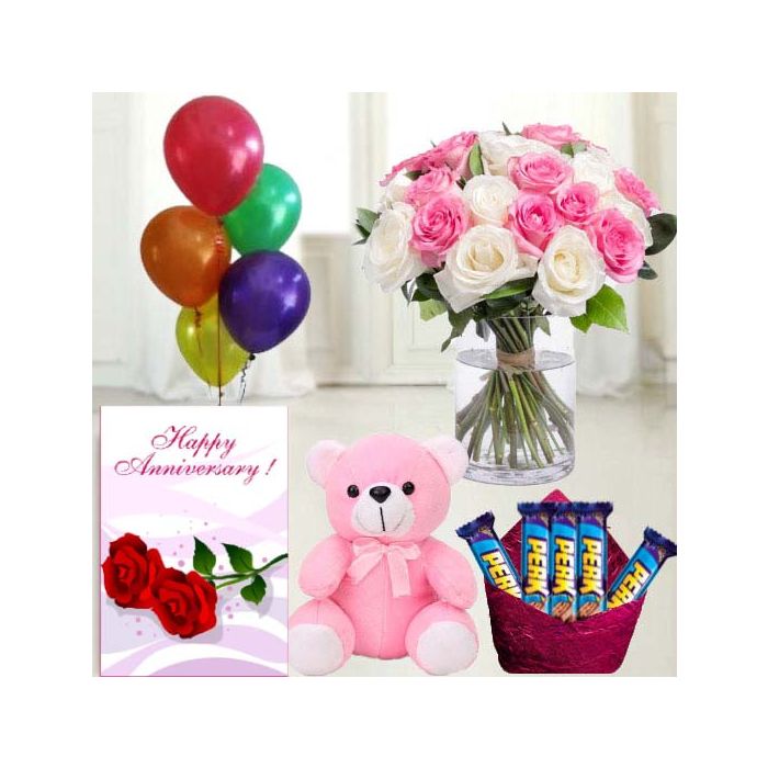 15 red and pink roses arranged in glass vase, 1feet height pink teddybear , set of 5 perk chocolates, anniversary greeting card with 5 blown balloons