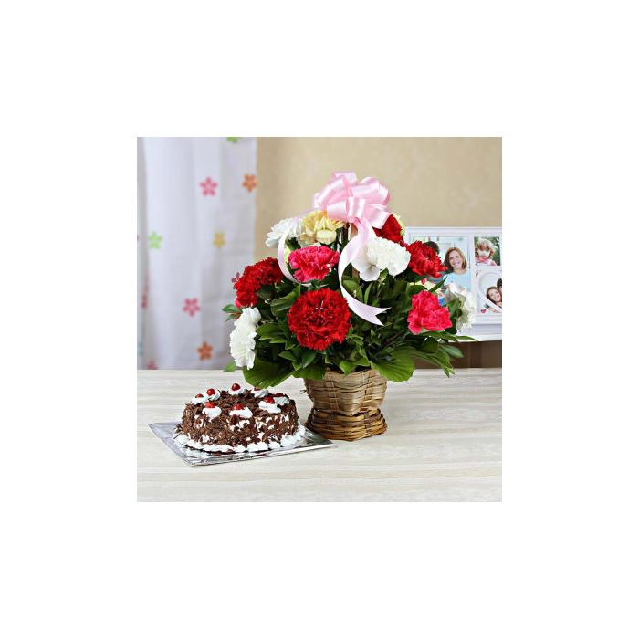 Delight your love with this beautiful bouquet of bright red and white carnations arranged in a charming basket. The chocolate pastry adds the rest of the magic. Perfect compliment from your end!