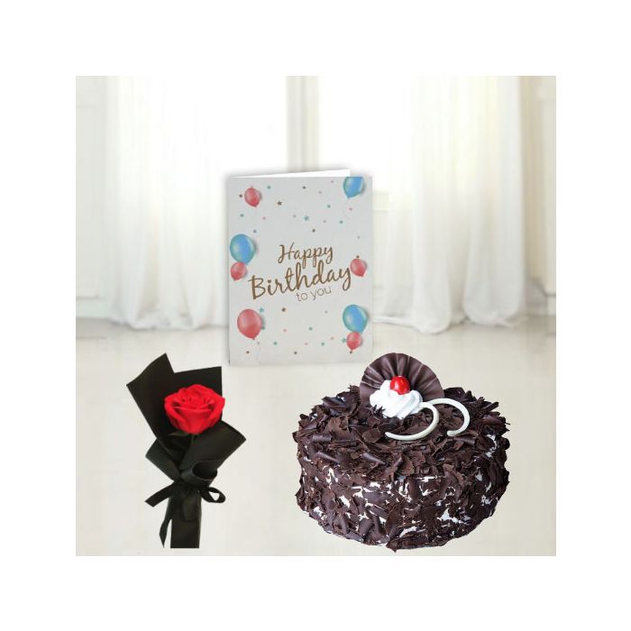 2 kg black forest cool cake, single red rose, birthday greeting card