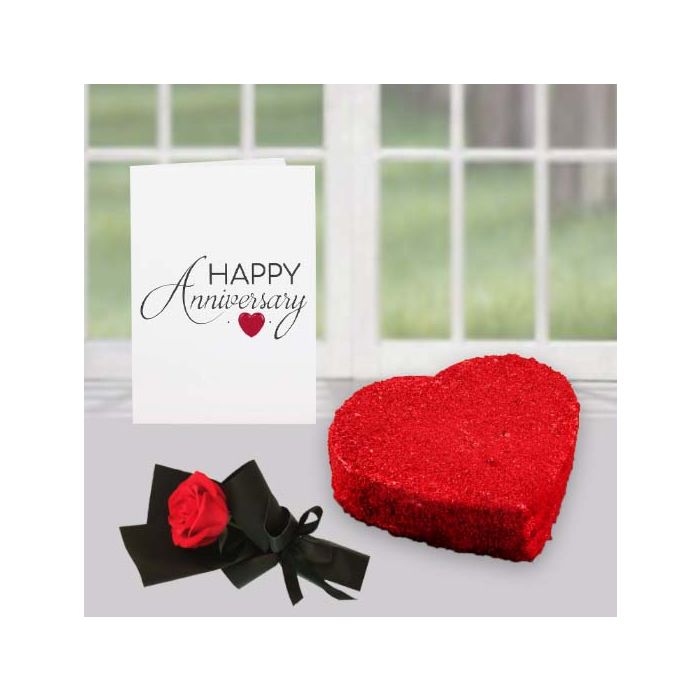 Heart shape cake is always big hit on any special occasions like anniversaries. Let your loved one know how much you care with this 2 kg heart shape cake. The scrumptious cake comes along with a single red rose and anniversary greeting card. It will surely make your anniversary a memorable one.