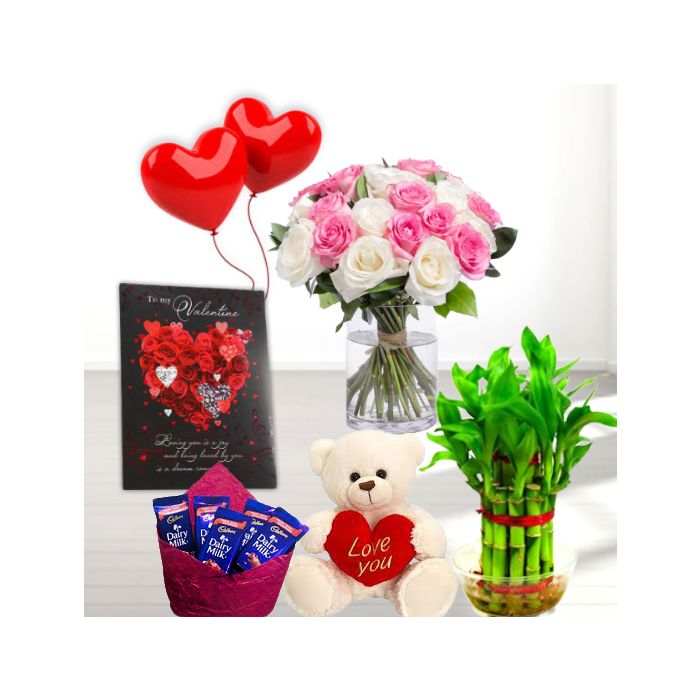 20 pink and white roses in glass vase, 1 feet height teddybear, pack of 5 dairy milk chocolates, 2 layer Lucky bamboo plant, 5 blown balloons with greeting card
