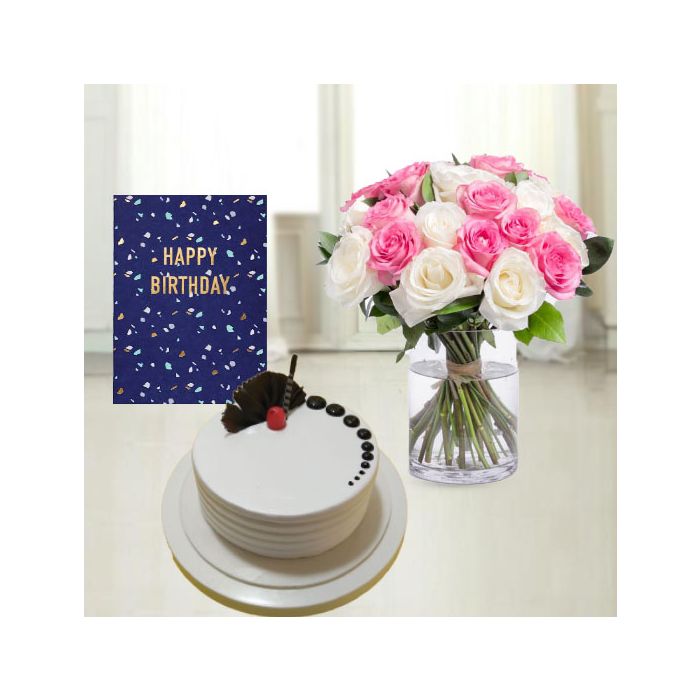 Show your loved ones how much you care on their birthday with this special gift set! It includes 20 beautiful pink and white roses in a glass vase, a delicious vanilla cool cake, and a birthday greeting card. With this thoughtful gift, they'll know just how much you mean to them.