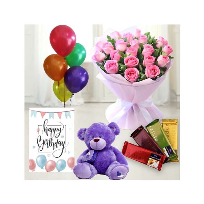 20 pink roses bunch , 6 inch teddybear , set of 4 temptations chocolates, birthday greeting card with 5 blown balloons