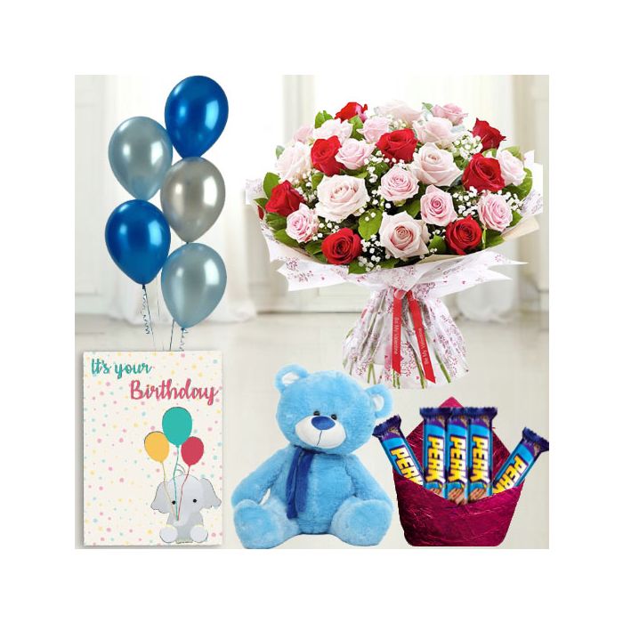 20 red and pink roses, 6 inch teddybear , set of 5 perk chocolates,birthday greeting card with 5 blown balloons