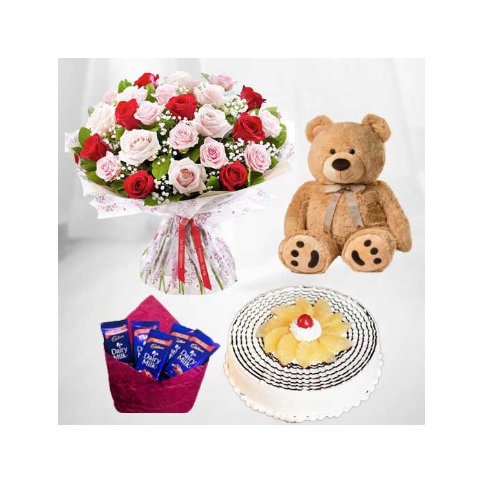 Looking for a special way to show your loved one how much you care? Our 20 red and pink roses bouquet with 1 feet height brown teddybear with pack of 5 dairy milk chocolates with pineapple cake is the perfect gift! The beautiful roses and teddybear are sure to impress, and the delicious chocolates and cake will make the recipient feel extra special. Order today and make someone's day!