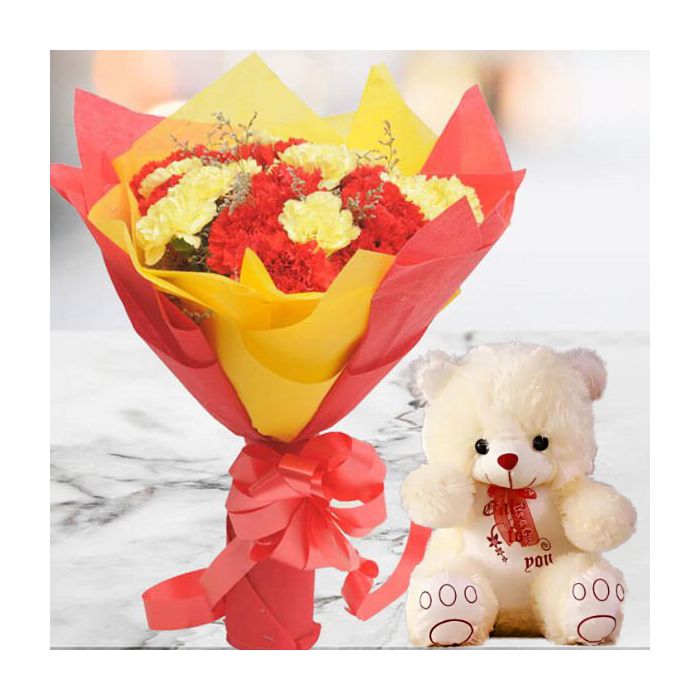 Looking for the perfect gift for your special someone? Look no further than this beautiful bunch of red and white carnations with a cute teddy bear! Standing at 1 foot tall, this arrangement is sure to make a big impression. The red and white carnations are a symbol of true love, making this an extra special present for your loved one. Teddy bears are known for their cuddly nature, making this an extra loving and thoughtful gift. Whether you're celebrating an anniversary, Valentine's Day, or just want to show your loved one how much you care, this gift is sure to put a smile on their face.