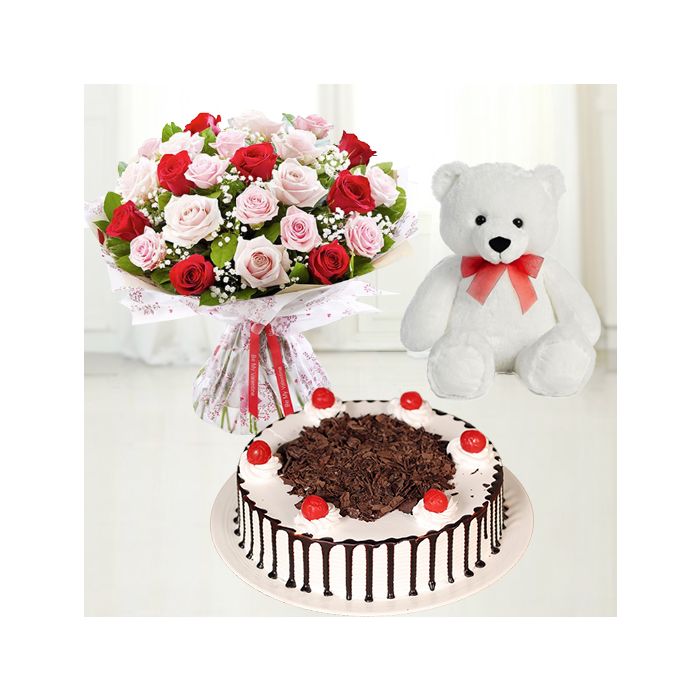 A beautiful bunch of 20 red and white roses, a delicious chocovanilla cake, and an adorable 6 inch teddybear - what more could you ask for? The perfect gift for your loved one on any special occasion, this amazing bundle is sure to make them smile from ear to ear.The roses are a symbol of love and affection, making this an ideal gift for your significant other, while the chocovanilla cake is the perfect way to show them how sweet your love is. The teddybear is sure to be a hit with anyone, young or old, and is a great way to show your loved one how much you care.With so much thoughtfulness and love packed into one gift,